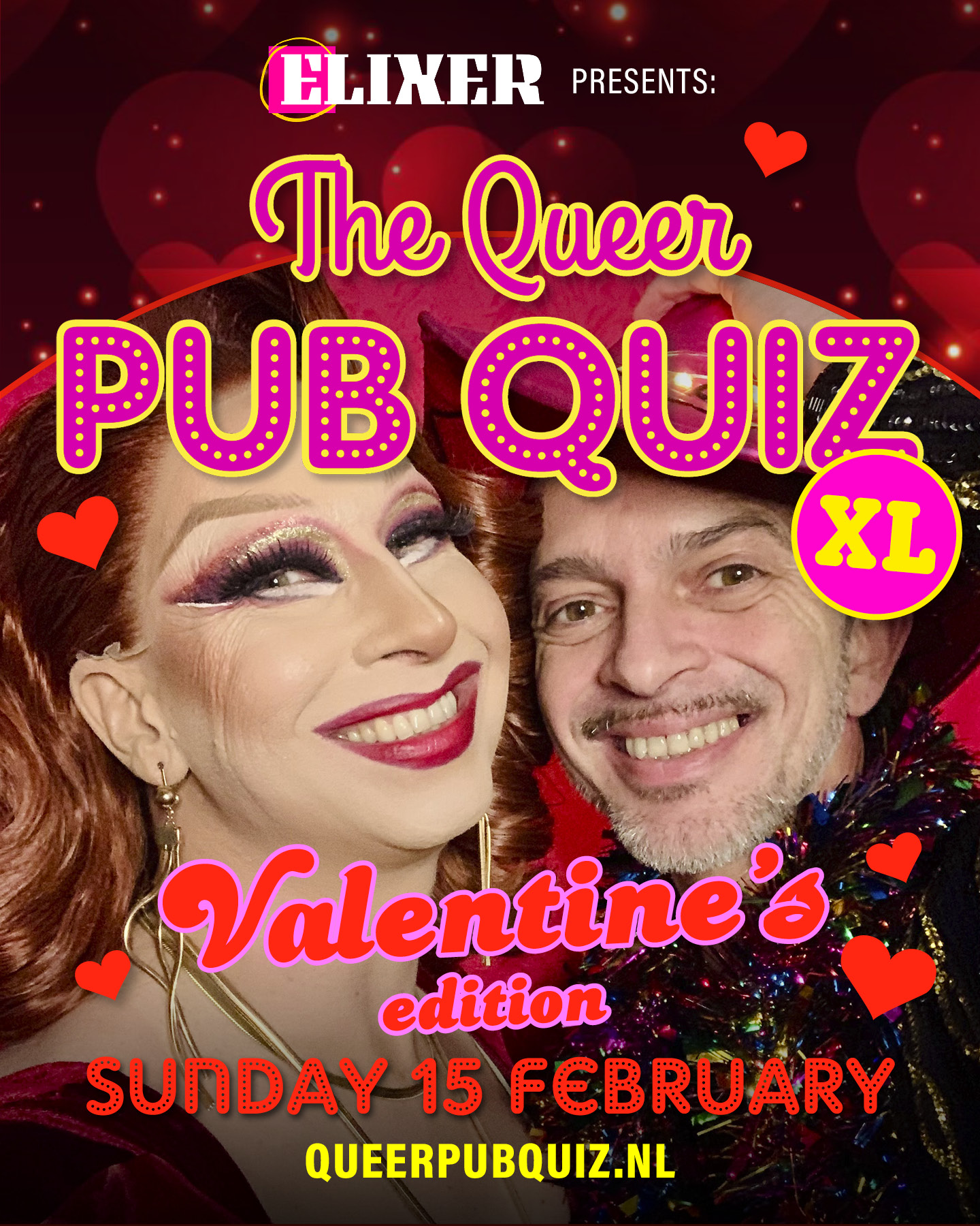 The Queer Pub Quiz XL Sunday 15 February 2026 - Valentine's edition. Quiz starts 16:00 till ± 18:15. Teams 2-4 people max. Tickets are per person not per team. Teams of 6 and more will be split up into smaller teams. No refunds.